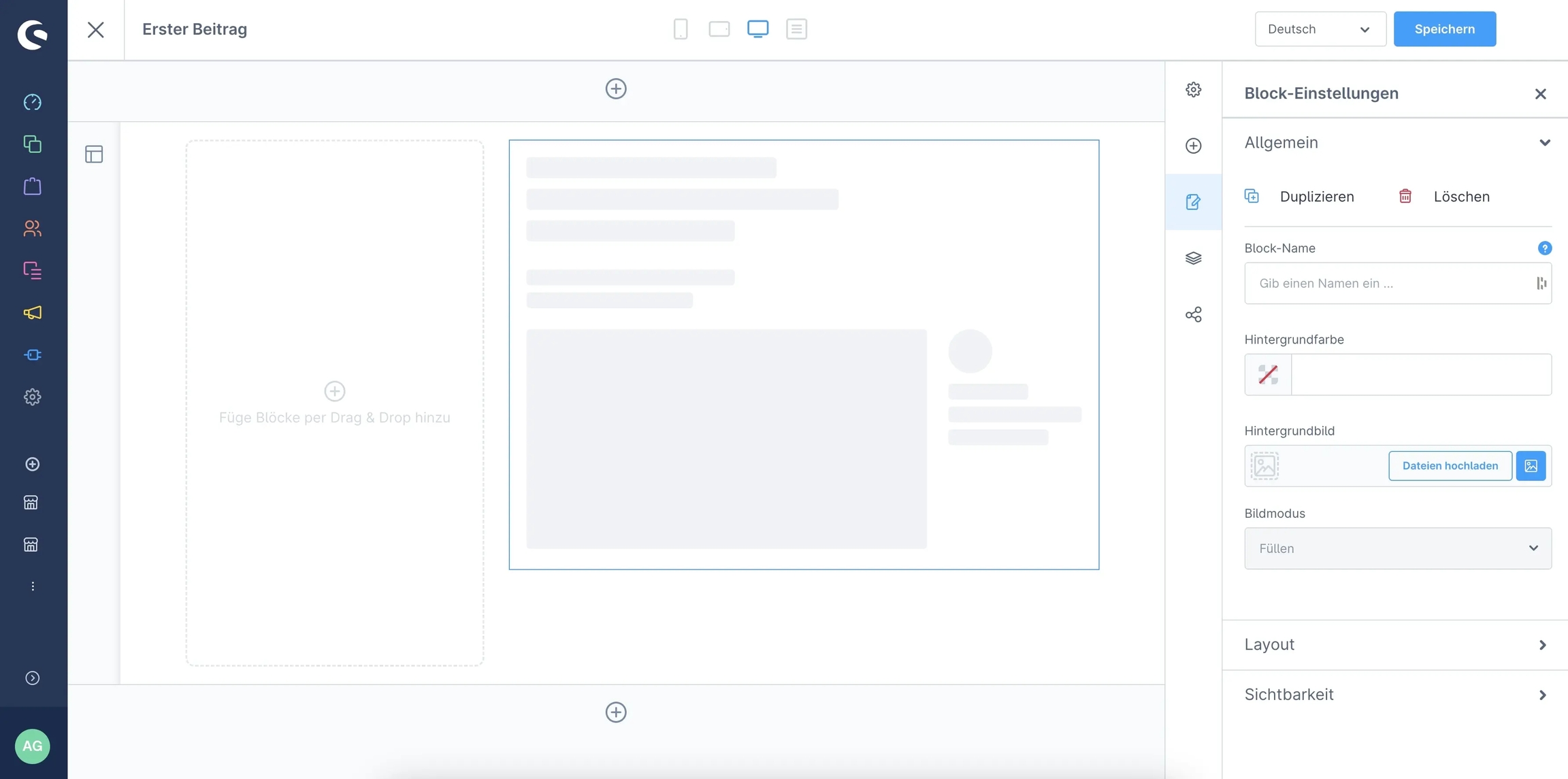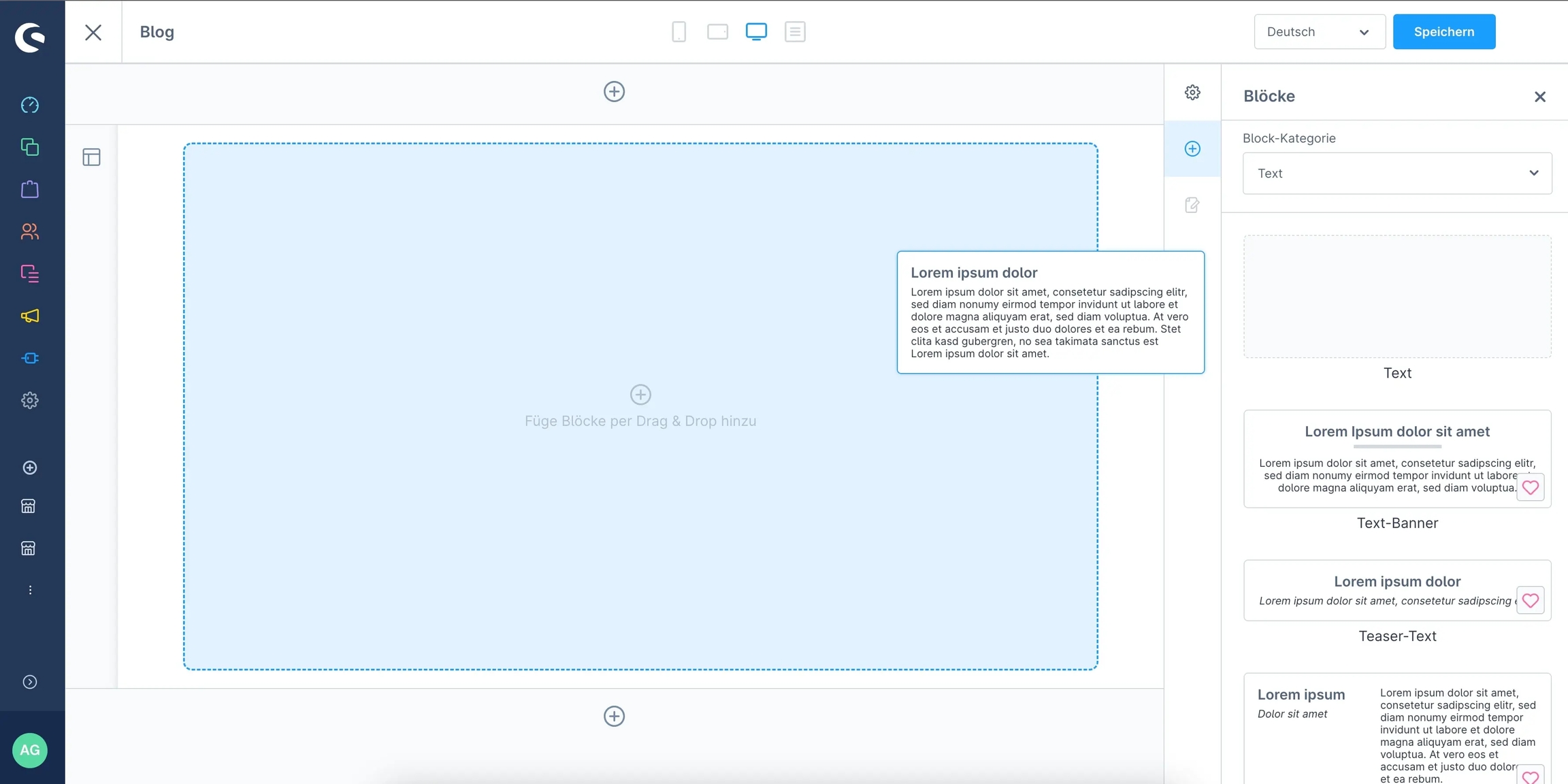 So that the newly created category "Blog" is not just an empty page, we now need a corresponding shopping experience. Therefore, create a new layout. It is important that the shopping experience is of the "store page" type. As soon as the shopping experience has been created, you can drag any block with a full-width element into the shopping experience. For example, the standard "Text" block from Shopware can be used directly for this.