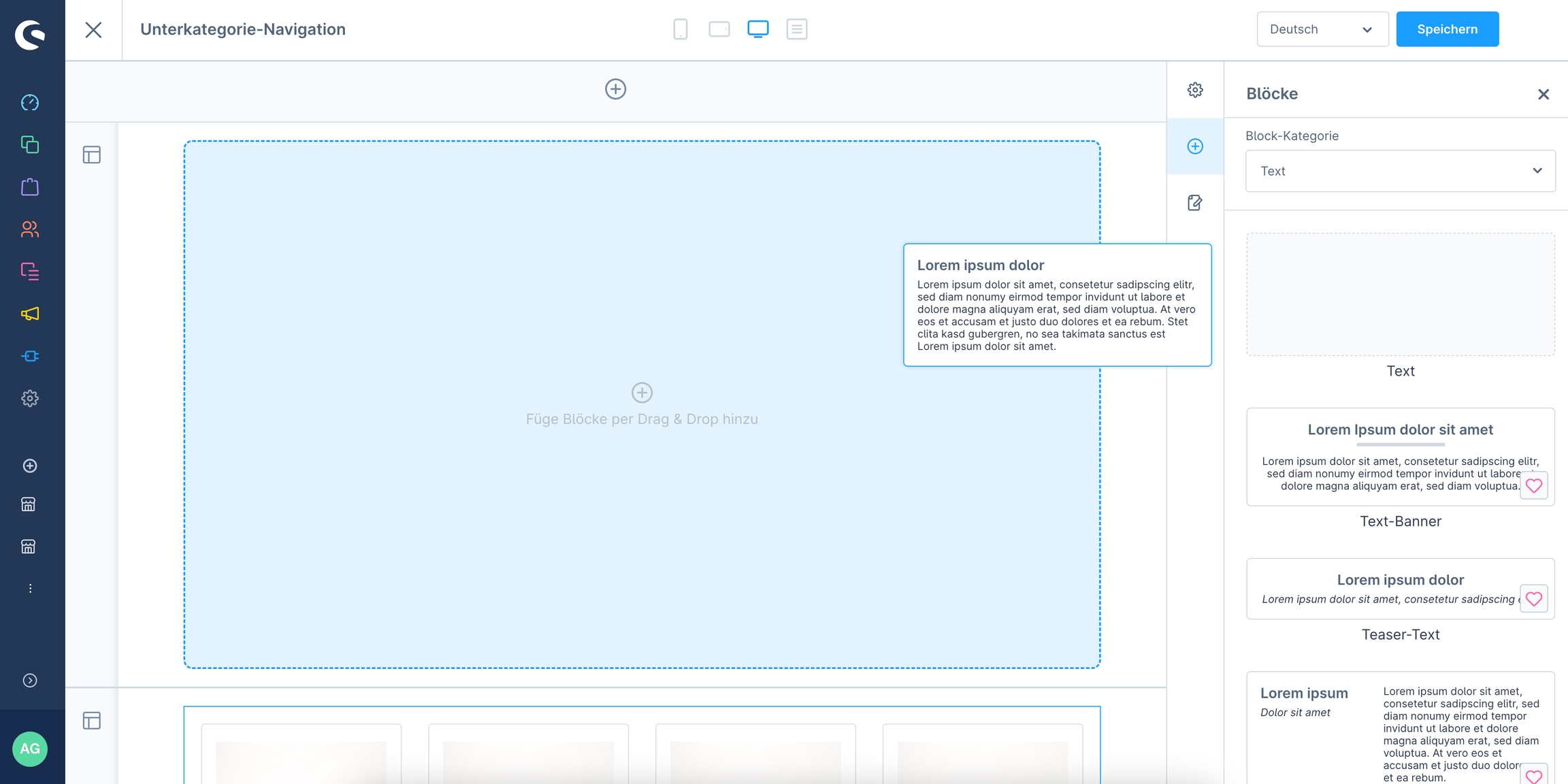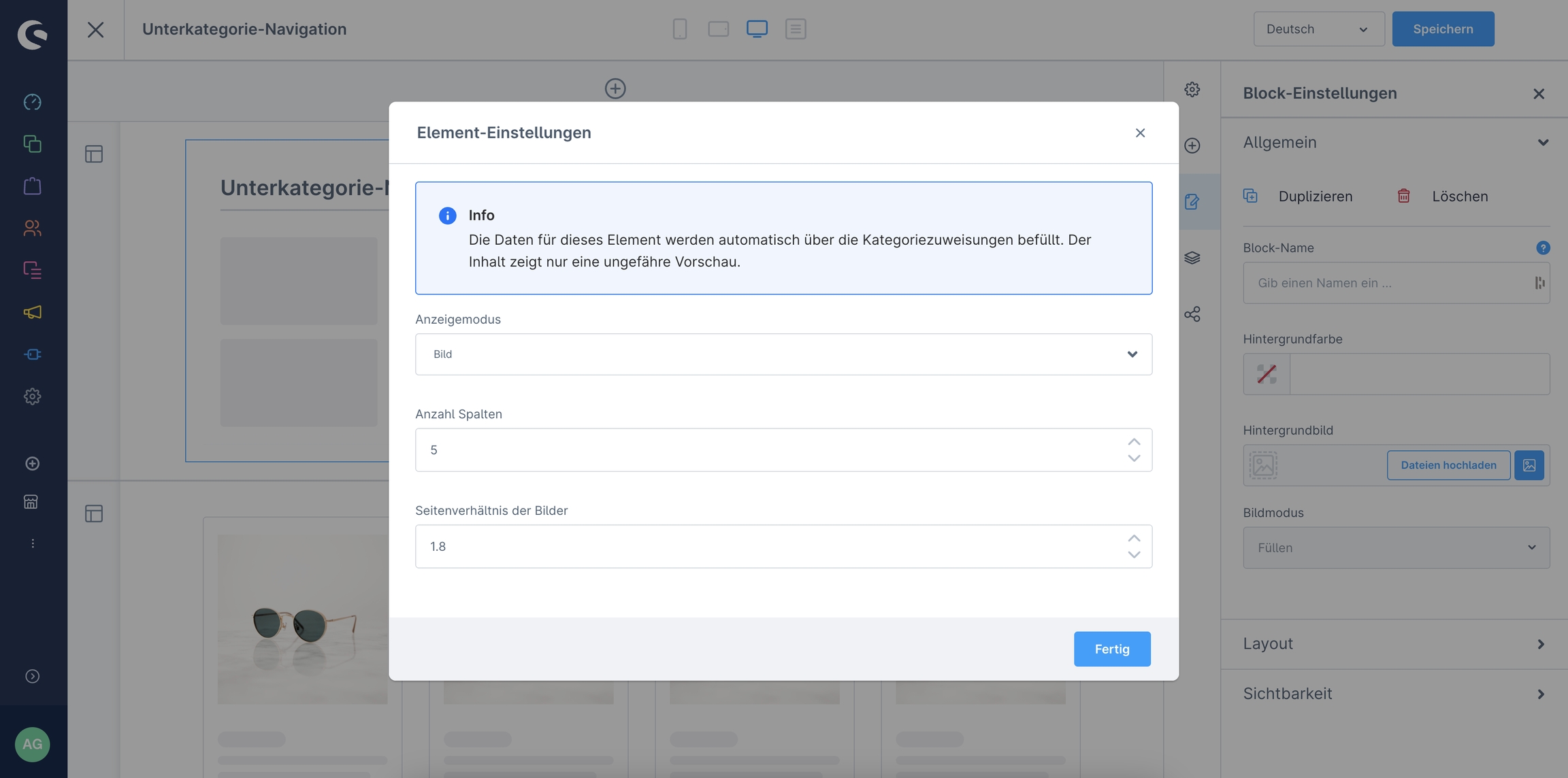 Nun kannst du das Element über die zwei Pfeile am rechten oberen Rand des Text Elements austauschen. Daraufhin öffnet sich ein ein Fenster mit allen verfügbaren Elementen. Wähle in dieser Ansicht das Element "Unterkategorie-Navigation". Nachdem du das Element gewählt hast, schließt sich das Fenster wieder und das Unterkategorie-Navigations-Element wurde erfolgreich mit dem Text Element ausgetauscht.