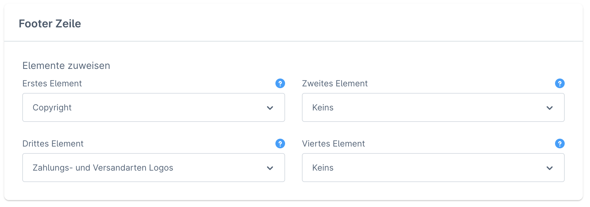 Über die nachfolgenden Felder kannst du die gewünschten Elemente entsprechend deiner Vorstellung und Reihenfolge verknüpfen. Das erste und zweite Element wird dabei auf der linken Seite und das dritte und vierte Element auf der rechten Seite der Zeile dargestellt. Mit der Option "Keins" kannst du ein oder mehrere Element(e) leer lassen, sodass du nicht gezwungen bist alle verfügbaren Elemente zu verwenden. Beachte dabei, dass jedes Element nur einmal in der Footer Zeile angezeigt werden kann.