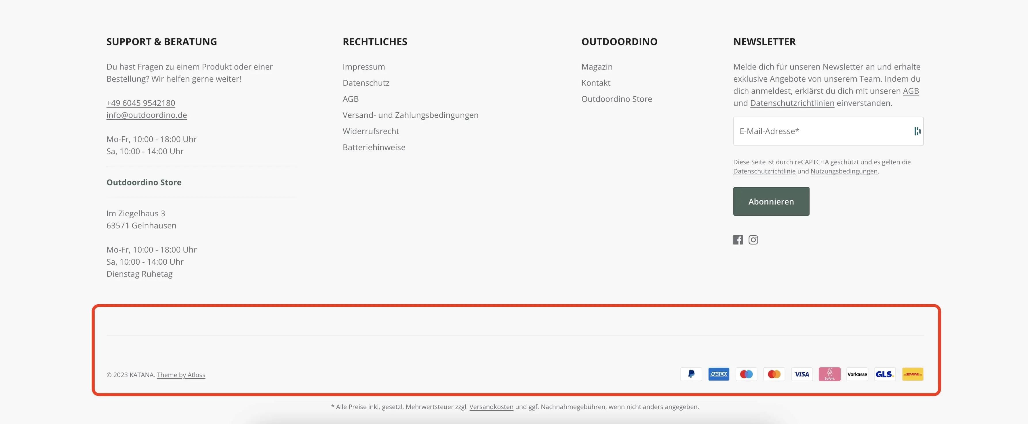 <figure><img src="https://content.gitbook.com/content/33GKvYy9I8ydtLM82CBS/blobs/xwNyfCZ7QIFTOJjybf8Y/footer-zeile.webp" alt=""><figcaption><p>Footer Zeile unseres Kunden <a href="https://outdoordino.de/">https://outdoordino.de/</a></p></figcaption></figure>