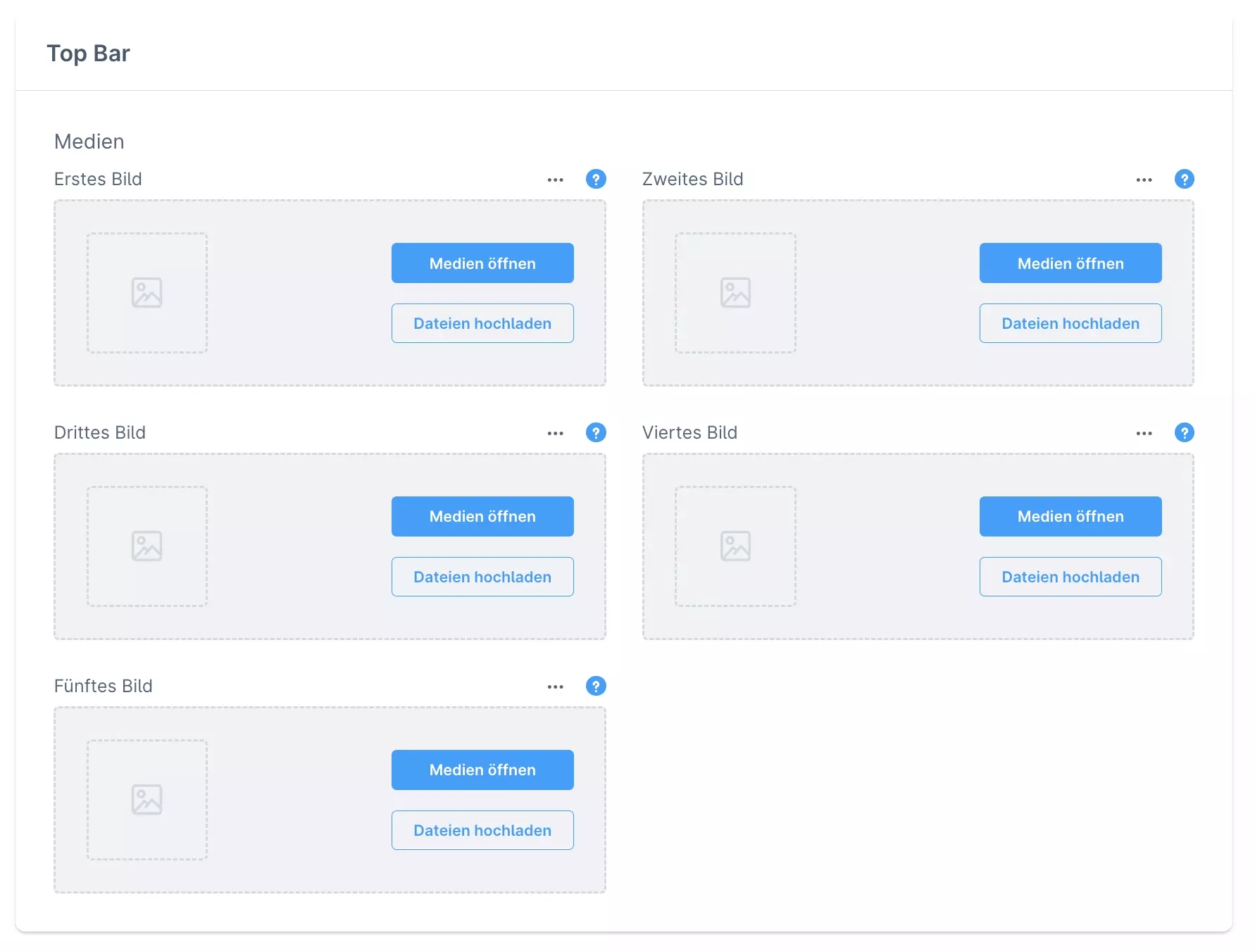Rechts neben dem Bild Mit dieser Option werden fünf Bezeichnungen in der Footer Top Bar eingebunden. Dazu können im nachfolgenden Abschnitt noch fünf passende Bilder zu den Bezeichnungen verknüpft werden. Die Bezeichnungen lassen sich dabei wie gewohnt über die nachfolgenden Textbausteine auf deine Bedürfnisse anpassen: