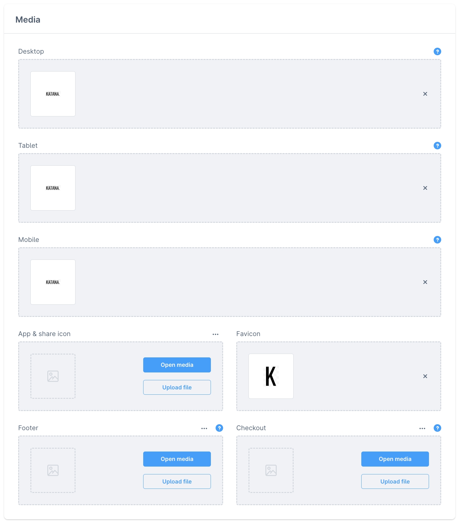This section allows you to integrate your own logo into your Shopware shop. Placeholders are defined here by default, which you can easily replace. To do so, simply remove the image link using the “✕” on the right-hand side.