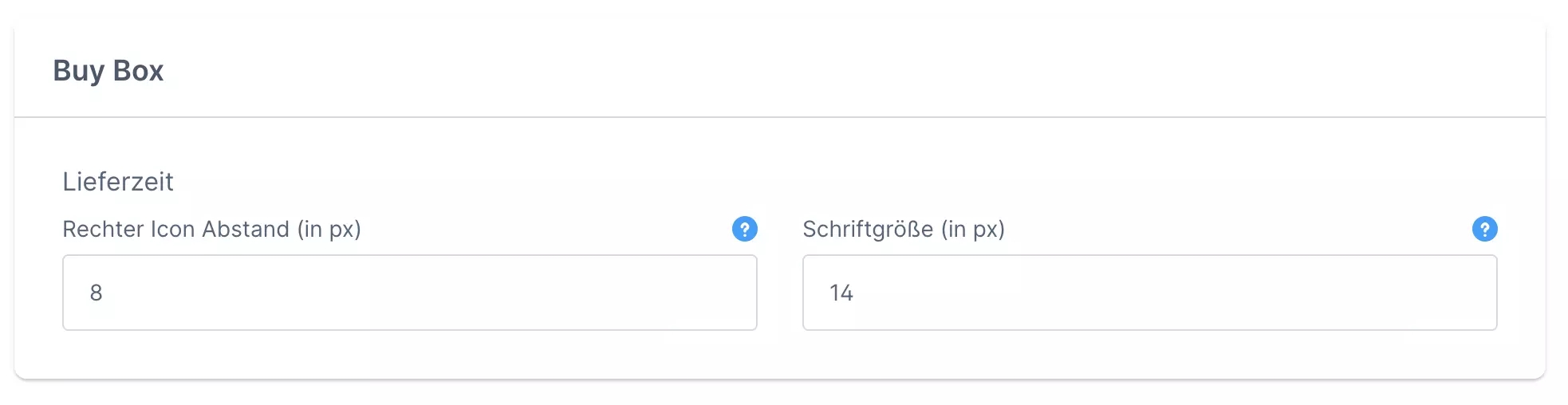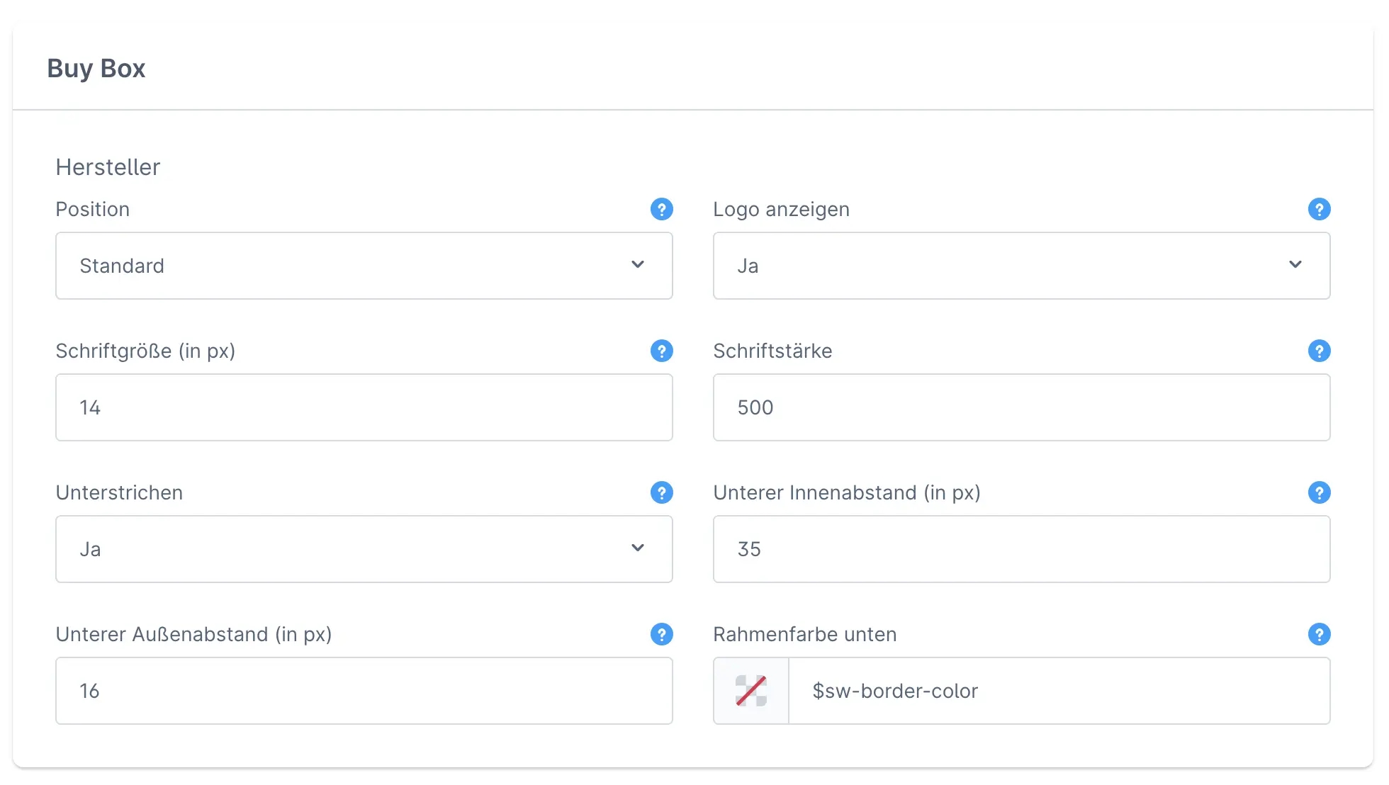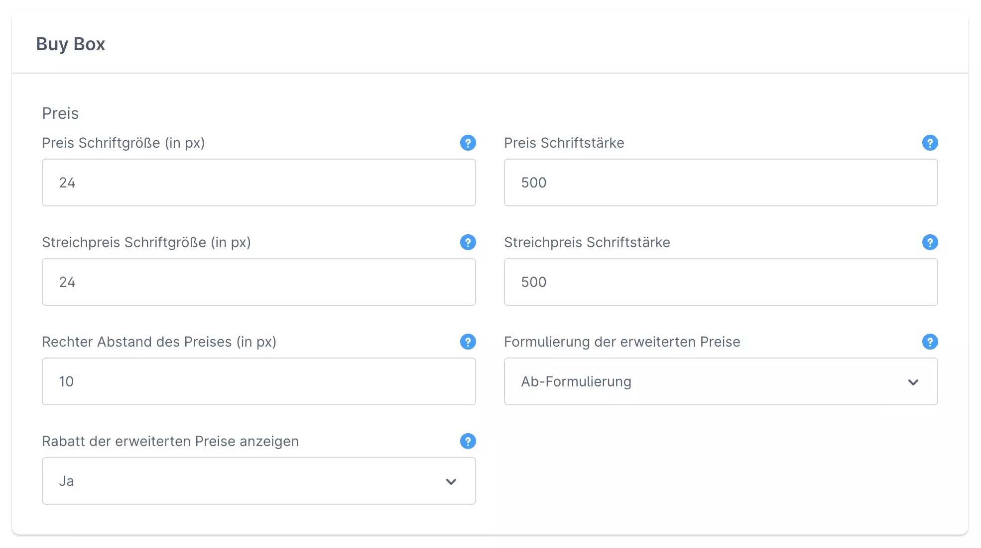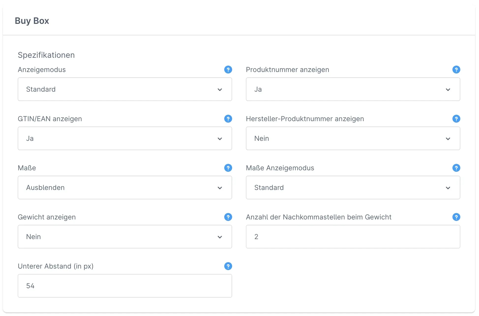 Die Buy Box ist neben der Galerie der zweite Hauptbestandteil der Produkt Detailseite und enthält alle Informationen zum Produkt. Hierunter fallen bspw. Preis- und Lieferzeitangaben, aber auch die Mengenauswahl und der Warenkorb Button. Durch die nachstehenden Konfigurationsmöglichkeiten kannst du die Buy Box ganz auf deine Wünsche zuschneiden. Die Felder sind hierbei von oben nach unten sortiert und entsprechend der Reihenfolge innerhalb der Buy Box.