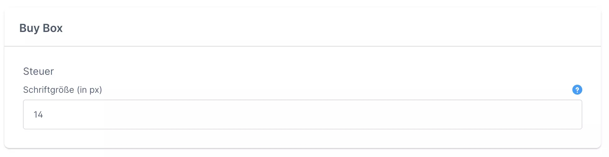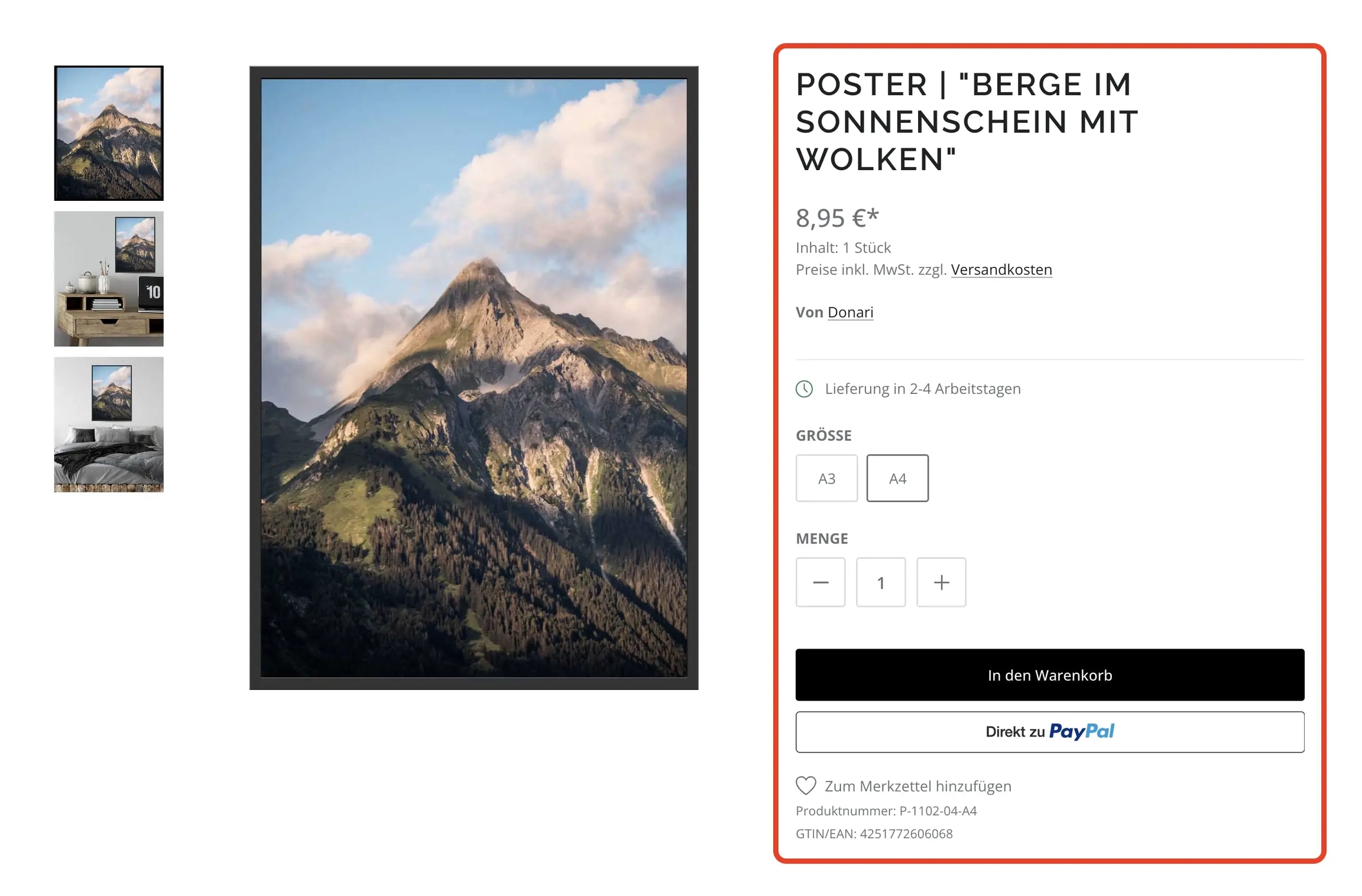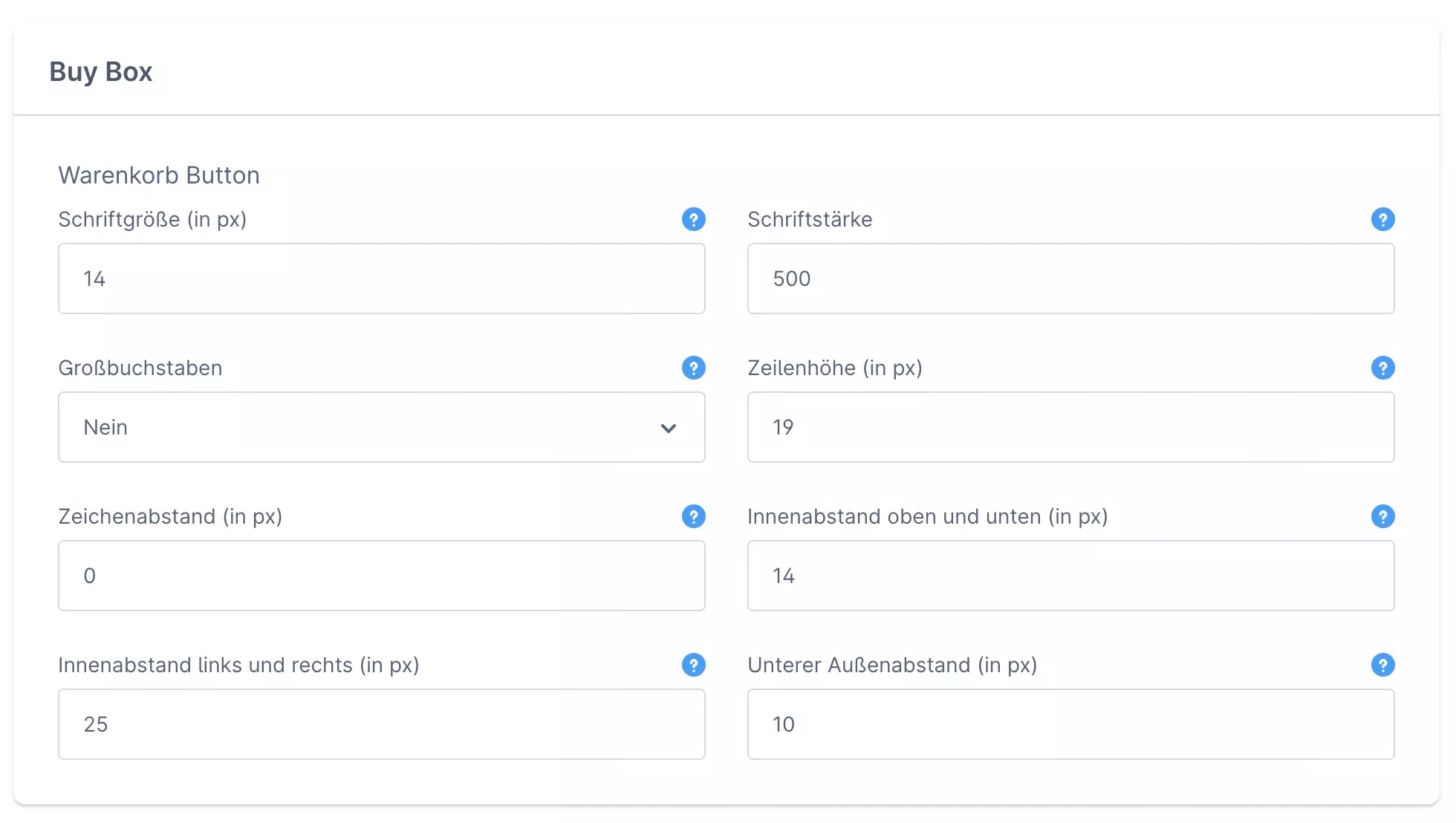 Die Buy Box ist neben der Galerie der zweite Hauptbestandteil der Produkt Detailseite und enthält alle Informationen zum Produkt. Hierunter fallen bspw. Preis- und Lieferzeitangaben, aber auch die Mengenauswahl und der Warenkorb Button. Durch die nachstehenden Konfigurationsmöglichkeiten kannst du die Buy Box ganz auf deine Wünsche zuschneiden. Die Felder sind hierbei von oben nach unten sortiert und entsprechend der Reihenfolge innerhalb der Buy Box.