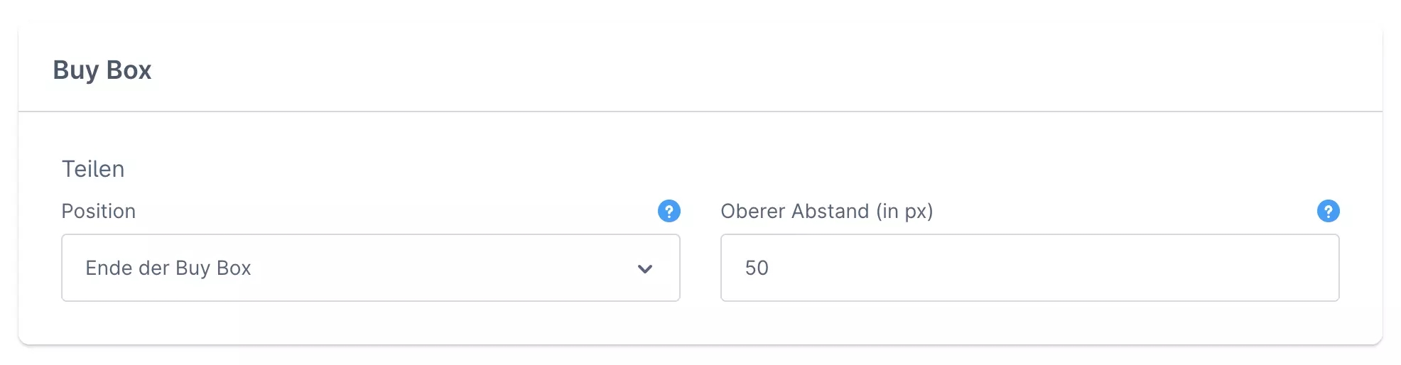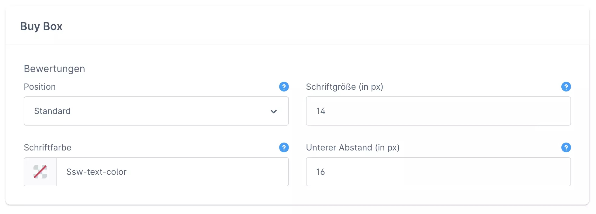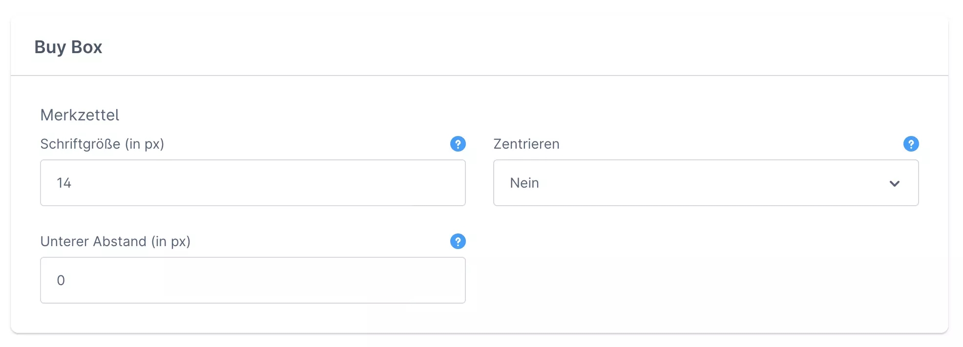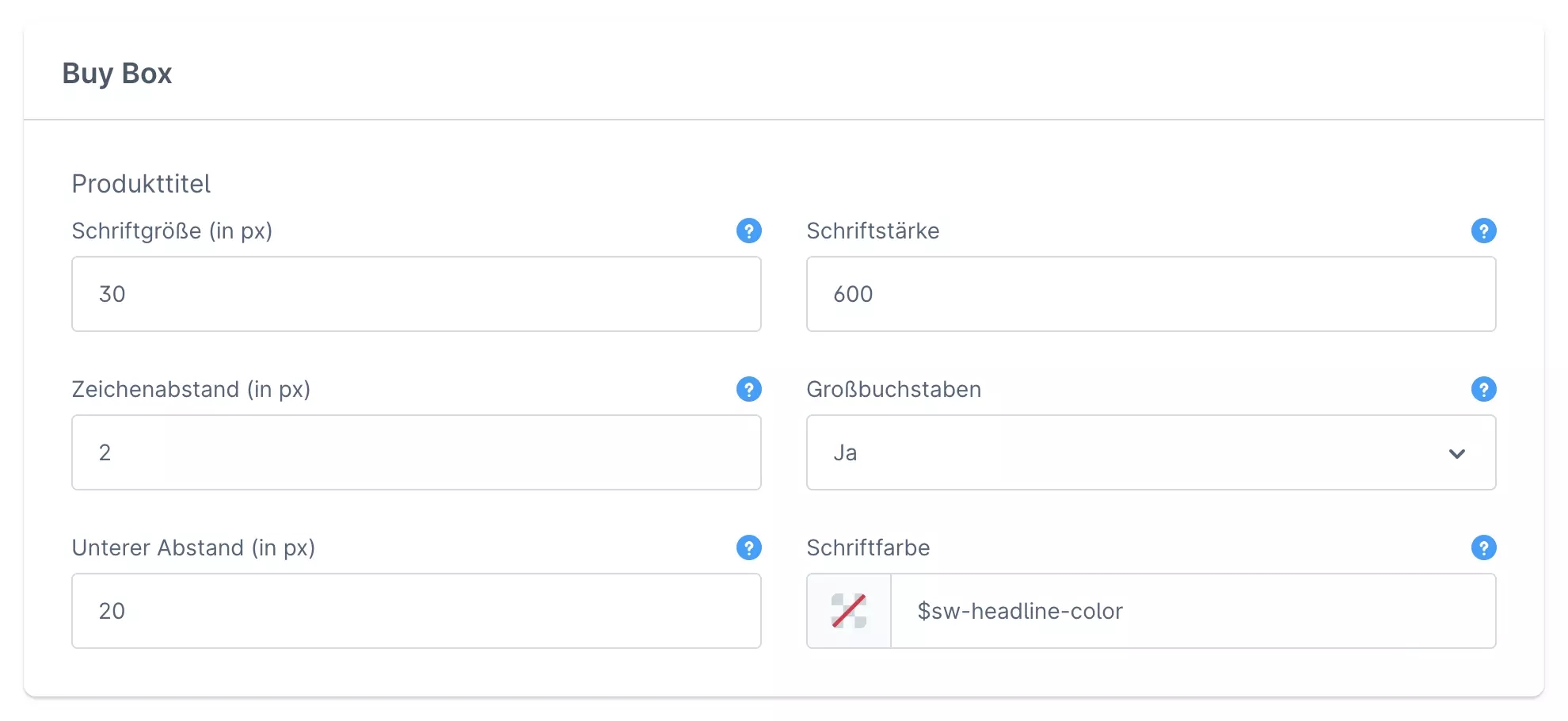 Die Buy Box ist neben der Galerie der zweite Hauptbestandteil der Produkt Detailseite und enthält alle Informationen zum Produkt. Hierunter fallen bspw. Preis- und Lieferzeitangaben, aber auch die Mengenauswahl und der Warenkorb Button. Durch die nachstehenden Konfigurationsmöglichkeiten kannst du die Buy Box ganz auf deine Wünsche zuschneiden. Die Felder sind hierbei von oben nach unten sortiert und entsprechend der Reihenfolge innerhalb der Buy Box.