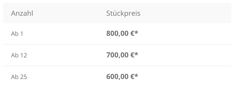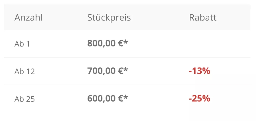 Ja Die Staffelpreis Tabelle wird um die Spalte "Rabatt" erweitert, sodass die prozentuale Einsparung pro Stück mit höherer Anzahl für den Besucher besser ersichtlich wird: