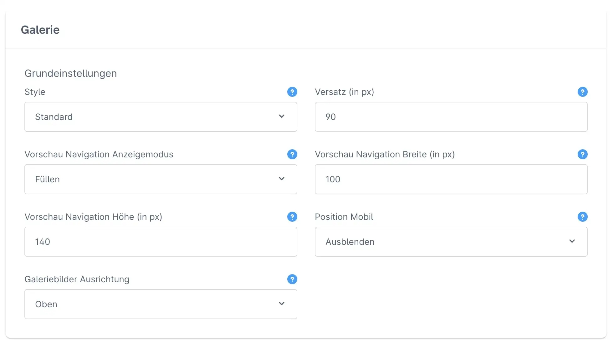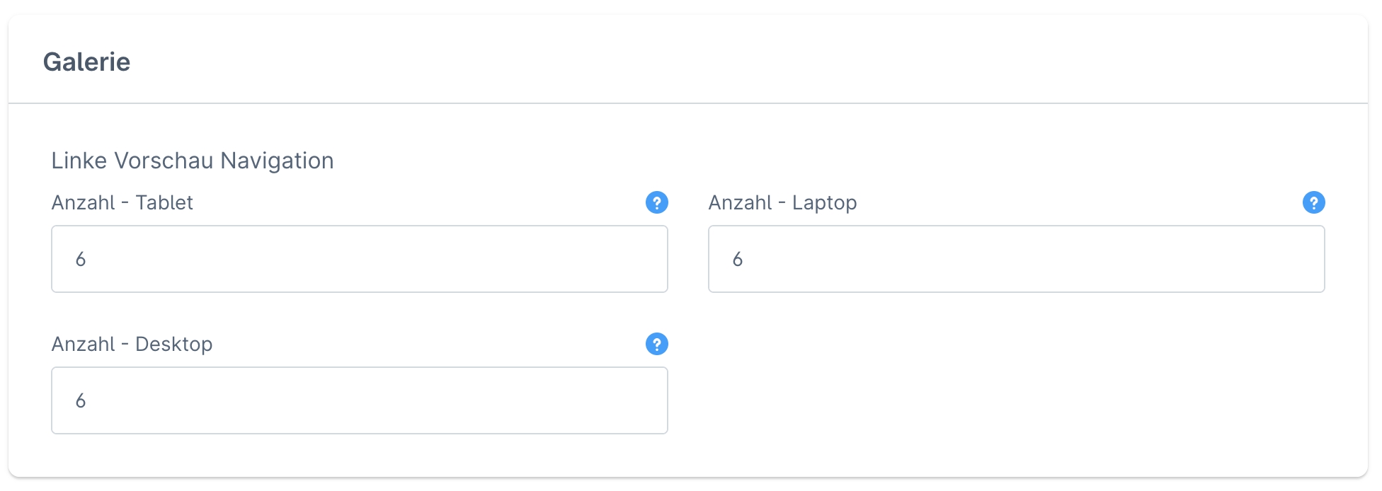 In diesem Abschnitt kannst du Einstellungen für deine Produktgalerie vornehmen. Die Galerie lässt sich hierbei in zwei Abschnitte unterteilen. Die Vorschau Navigation und das ausgewählte Bild.