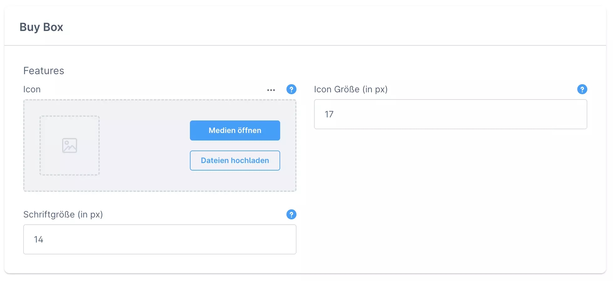 Bei den Features handelt es sich um eine enthaltene Erweiterung des Themes. Diese können pro Produkt und Variante individuell angepasst und in diesem Abschnitt zusätzlich konfiguriert werden.