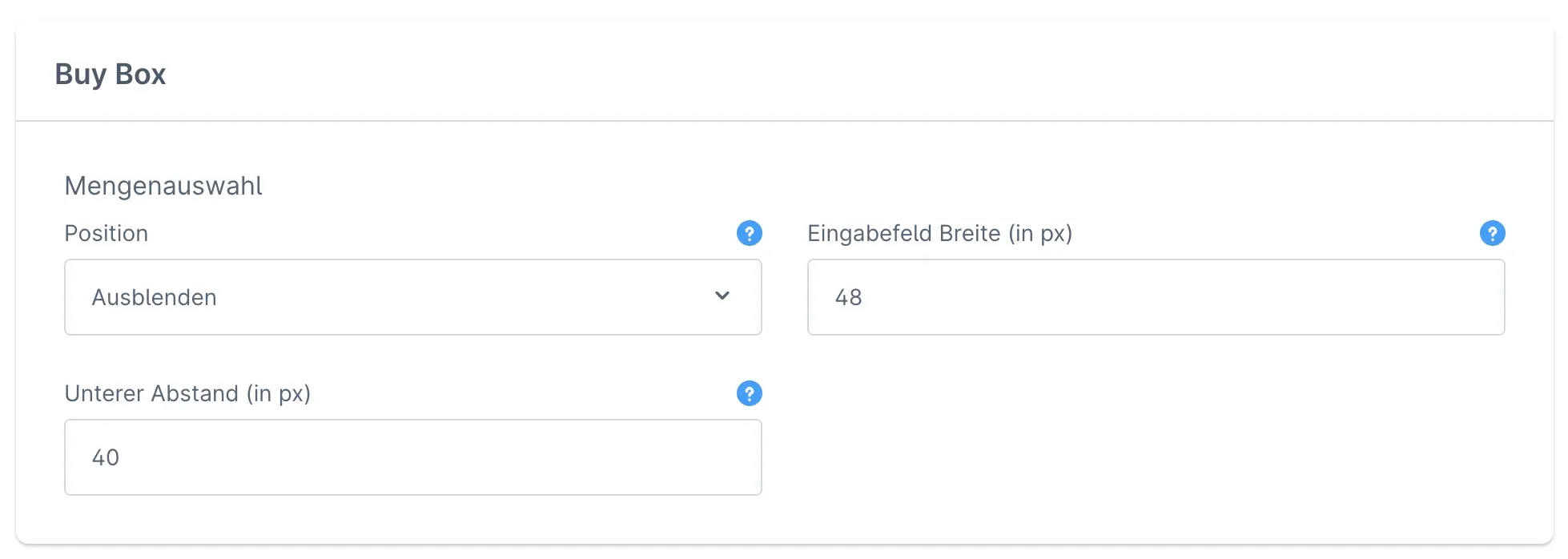 Ausblenden Deaktiviert die Mengenauswahl auf der Produkt Detailseite.