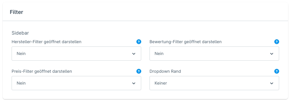 In dieser Sektion kannst du u.A. festlegen die standardmäßigen Shopware Filter "Hersteller", "Bewertung" und "Preis" aufgeklappt darzustellen. Selbst angelegte Filter lassen sich über ein Theme Feature geöffnet darstellen.