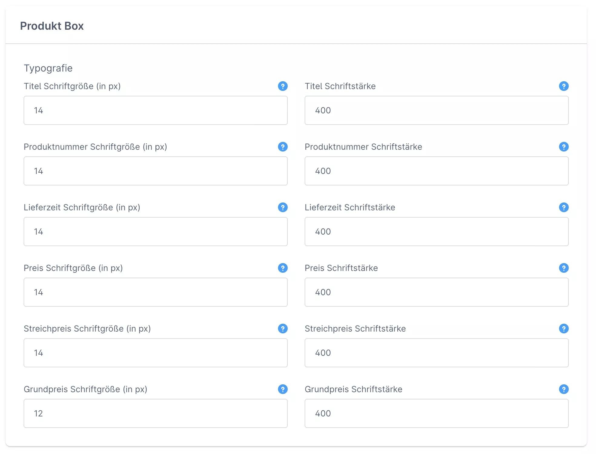 In diesem Abschnitt kannst du die Schriftgröße und Schriftstärke der einzelnen Elemente innerhalb der Produkt Box festlegen. Je nach Schriftart stehen dir für die Schriftstärke folgende Konfigurationsoptionen zur Verfügung: