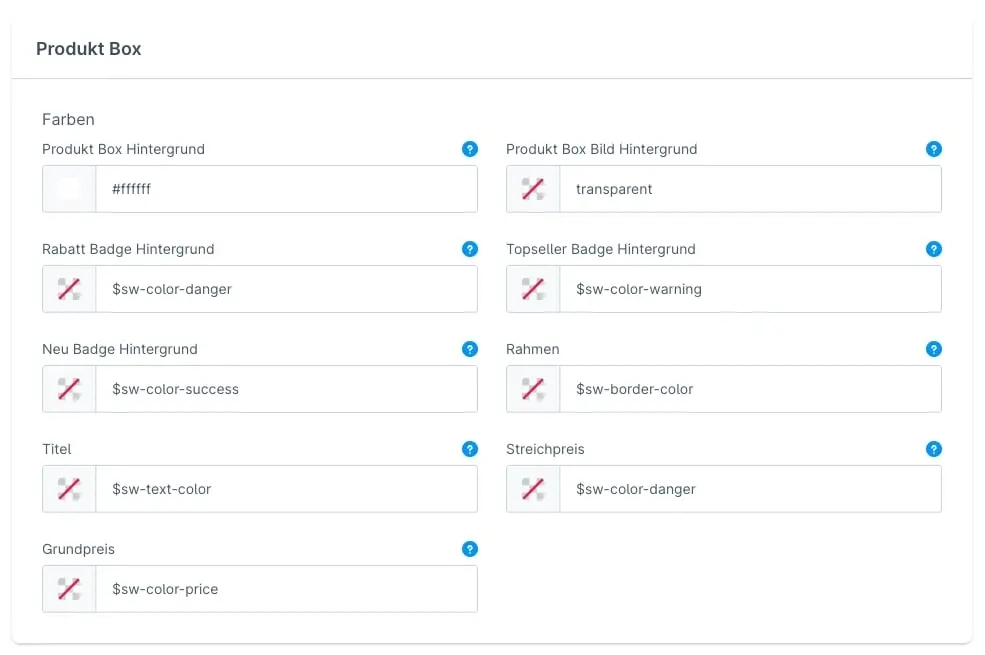 Definiere die Rahmenfarbe der Produkt Box. Standardmäßig wird hier die globale Rahmenfarbe über eine Variable eingebunden.