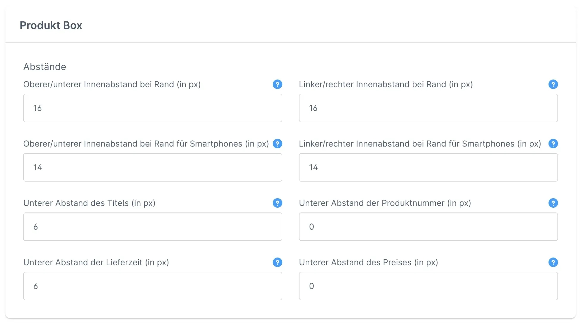 Lege den oberen und unteren Innenabstand der Produkt Box fest. Diese Einstellung wird lediglich bei einem gewählten Rand-Styling angewendet.