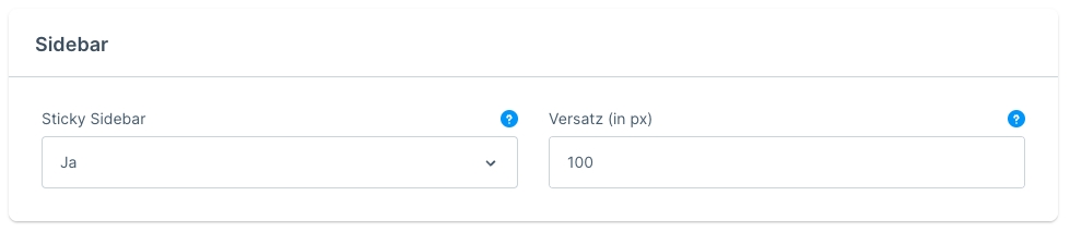 Sobald die Sticky Sidebar aktiviert wurde, kommt diese Einstellung zum Tragen. So kann sich je nach Konfiguration die Höhe deines Headers unterscheiden. Da der Header ebenfalls ein mitscrollendes Seitenelement ist, kann es zu Überschneidungen von Sidebar und Header kommen. Damit man diesem Problem entgegensteuern kann, hast du die Möglichkeit in diesem Feld den Versatz zu definieren, damit die Sidebar ausreichend Abstand zum Header behält.