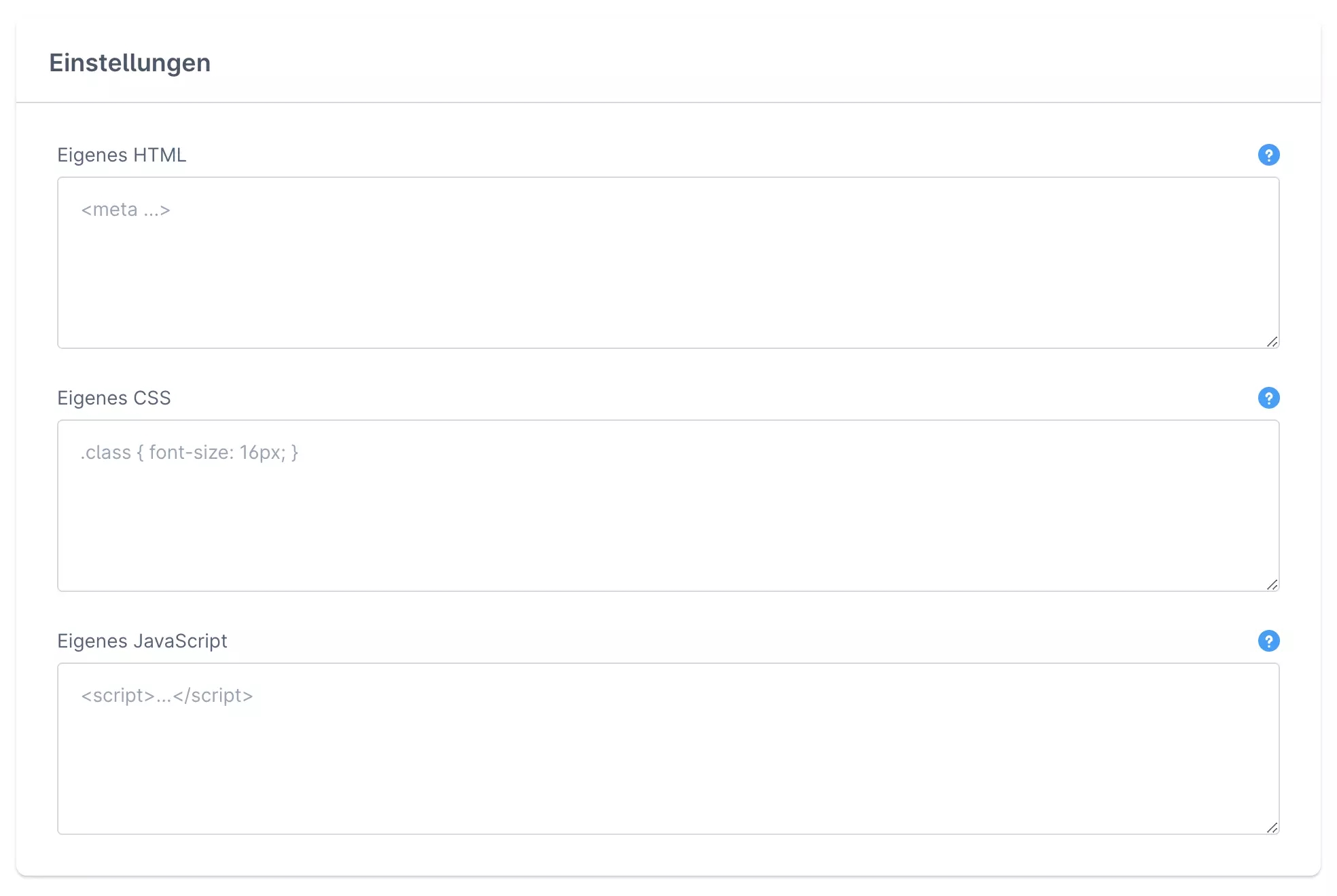 Dieser HTML-Code wird direkt im <head> Bereich geladen, um bspw. <meta> oder <style> Tags zu ergänzen.